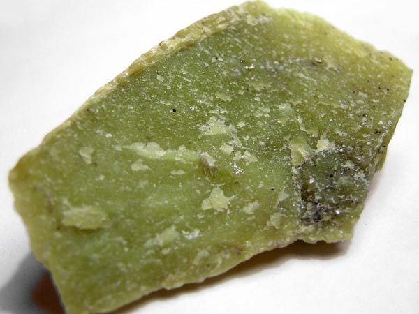 蛇紋石質(zhì)玉石質(zhì)地呈細(xì)膩的致密塊體,質(zhì)地細(xì)膩,用手觸摸有滑感。它由細(xì)小纖維狀、葉片狀和膠狀蛇紋石晶體組成,呈網(wǎng)斑狀結(jié)構(gòu)。有時(shí)在均勻分布的基底上,可見(jiàn)密集堆積的云朵狀白色斑狀。少數(shù)纖維狀塊體琢磨后有貓眼效應(yīng)。