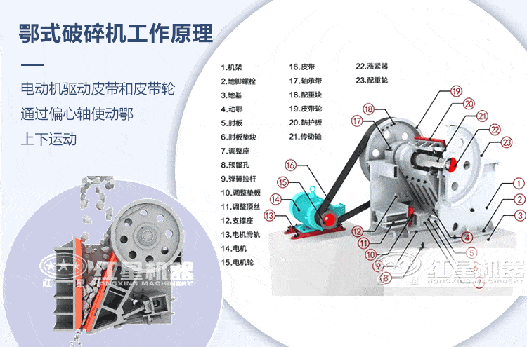 電動機驅動皮帶和皮帶輪,通過偏心軸使動鄂上下運動,當動鄂上升時肘板與動鄂間夾角變大,從而推動動鄂板向固定鄂板接近,與其同時物料被壓碎或劈碎,達到破碎的目的;當動鄂下行時,肘板與動鄂夾角變小,動鄂板在拉桿彈簧的作用下,離開固定鄂板,此時已破碎物料從破碎腔下口排出。隨著電動機連續(xù)轉動而破碎機動鄂作周期運動壓碎和排泄物料,實現(xiàn)鄂式破碎機的批量生產(chǎn)。